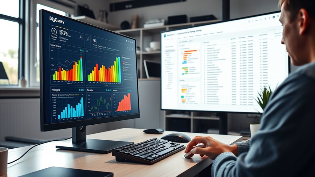 Leveraging BigQuery for SEO data analysis at scale lets you efficiently process massive search datasets, uncover patterns, and make smarter decisions. You can cluster keywords, identify content gaps, and analyze backlink profiles from sources like Ahrefs or SEMrush—all in real-time. This tool helps you run complex queries that would be costly otherwise, giving you a competitive edge. Continue exploring to discover how you can unleash powerful SEO insights with BigQuery.