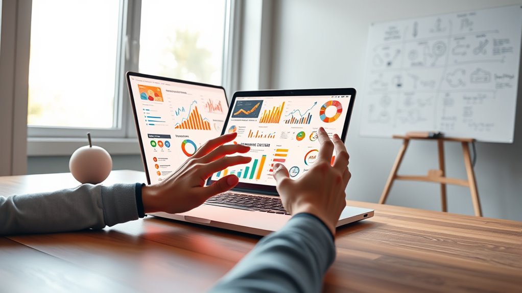 To measure your data storytelling impact, focus on feedback metrics and engagement analysis. Track how your audience responds through comments, shares, and direct feedback to gauge emotional connection and clarity. Use engagement analysis to see if viewers interact more with your visuals or take action afterward. These metrics reveal whether your insights inspire decision-making or motivate your audience, helping you refine future presentations for greater influence.