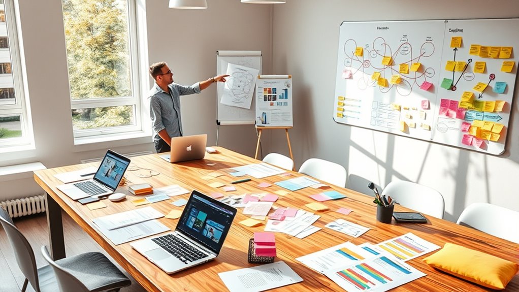To build a content hub with effective topic clustering, start by identifying core themes relevant to your audience. Organize content into main clusters around these themes, using various formats like blog posts, videos, and infographics. Link related content naturally to guide visitors smoothly from general overviews to detailed insights. Keep your content consistent, fresh, and optimized for SEO. If you keep exploring, you’ll discover how to create a powerful, engaging platform that attracts and retains users.