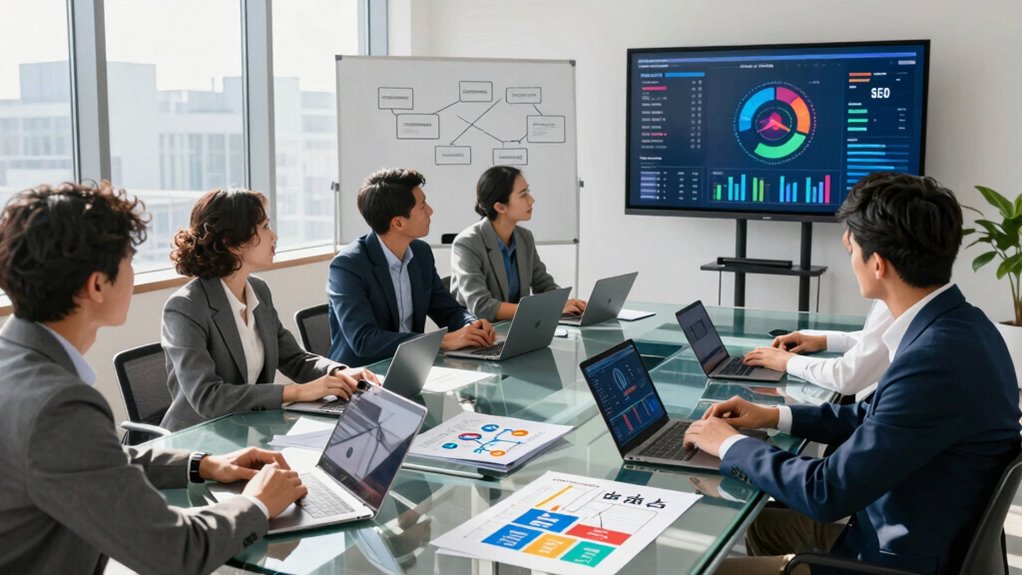 Think of tools as the bridges connecting your SEO teams. Platforms like SEMrush, Ahrefs, and Screaming Frog act as navigators, helping you perform content audits and guarantee keyword alignment across departments. These tools facilitate real-time collaboration, enabling everyone to stay on the same page and share insights effortlessly. By leveraging them, you turn a scattered crew into a synchronized orchestra, harmonizing efforts to boost your organization’s SEO performance.