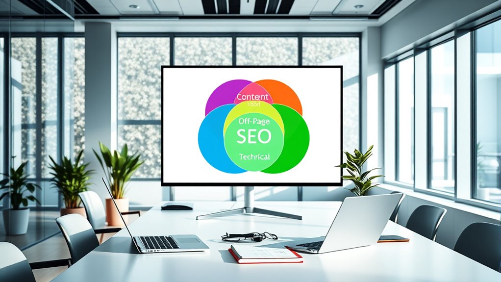 To balance content, technical, and off-page SEO, focus on creating high-quality, relevant content that attracts links and engages your audience. Guarantee your website is fast, mobile-friendly, and well-structured for search engines. Build backlinks naturally through outreach and valuable content. When you integrate these pillars well, your site becomes more authoritative and easier to find. Keep exploring these strategies to develop a strong, sustainable SEO approach that drives ongoing growth.