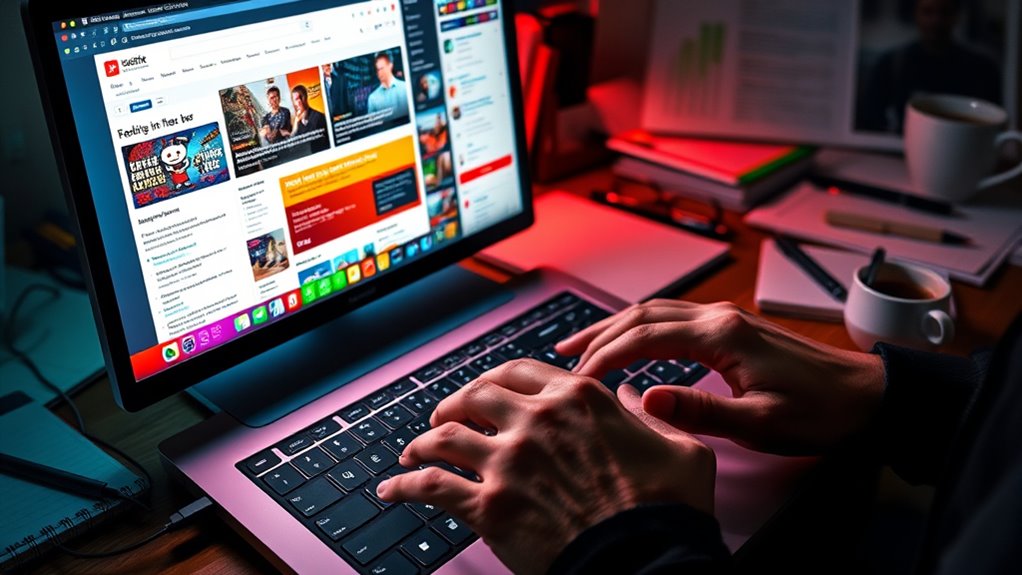 To identify trending topics quickly, focus on forum engagement and Reddit trends. Check popular subreddits and look for posts with high upvotes and comments, indicating active interest. Use Reddit’s trending page and filter by your niche to spot emerging discussions. On forums, monitor threads with rapid replies and high engagement. These signals help you catch trending topics early and tailor your content to what’s gaining momentum.