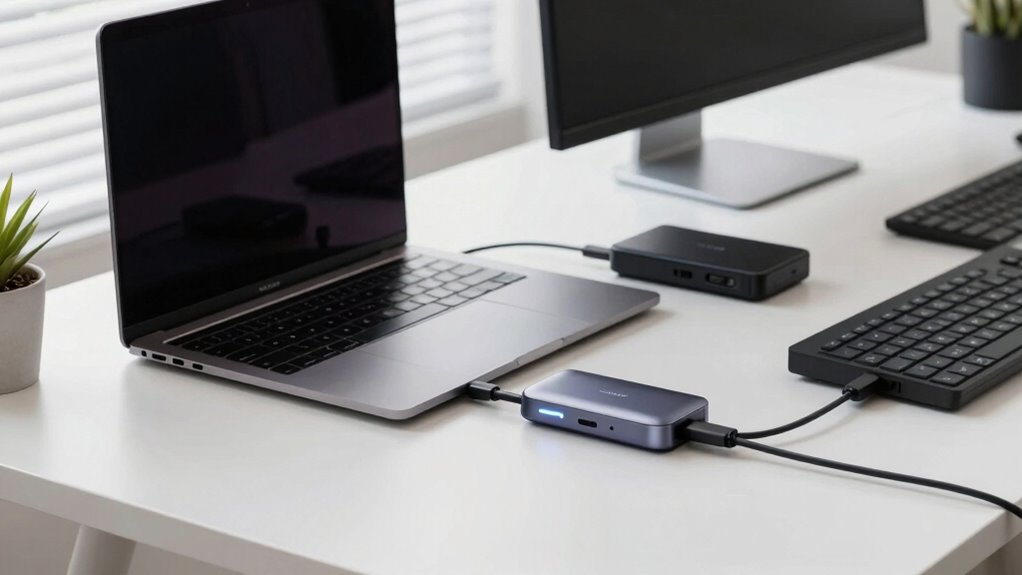 You can connect up to six devices simultaneously with a Thunderbolt dock, depending on the specific model and its device compatibility. The dock’s Power Delivery feature guarantees your laptop stays charged while you connect multiple peripherals. Keep in mind, some docks may have limits based on bandwidth and device compatibility, so check the specifications to make sure your setup works smoothly. This way, you maximize your high-performance laptop’s capabilities efficiently.