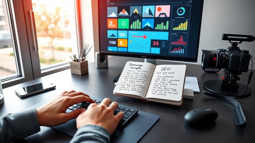 To optimize your images for SEO, focus on using modern formats like WebP or AVIF to reduce load times without sacrificing quality. Write descriptive, keyword-relevant alt text that improves accessibility and search visibility. Implement proper indexing strategies, such as schema markup and hosting images on your own domain, to enhance discoverability. Mastering these techniques can considerably boost your rankings and user experience—exploring further will help you open even more SEO benefits.