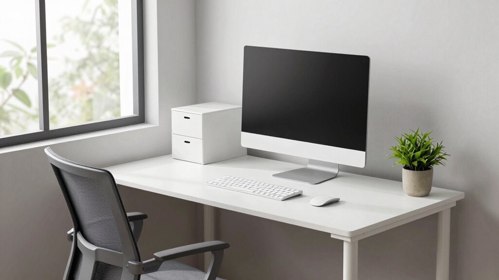 Effective storage options are essential in compact workstations because they help keep small spaces organized and clutter-free. Many designs incorporate integrated drawers, shelves, or cabinets to maximize limited footprints. Adjustable or modular storage components allow me to customize the workspace to fit different organizational needs, making the setup more versatile. Multi-tier shelving and under-desk compartments are excellent for utilizing vertical space efficiently, giving me room for essentials without sacrificing surface area. Built-in cable management systems help keep cords tidy and prevent tangles, which is vital in small offices. Some workstations also include hooks, small drawers, or side pockets for accessories like headphones, pens, and documents, ensuring everything is within reach and easy to find. Good storage choices make small workspaces more functional and less cluttered.
