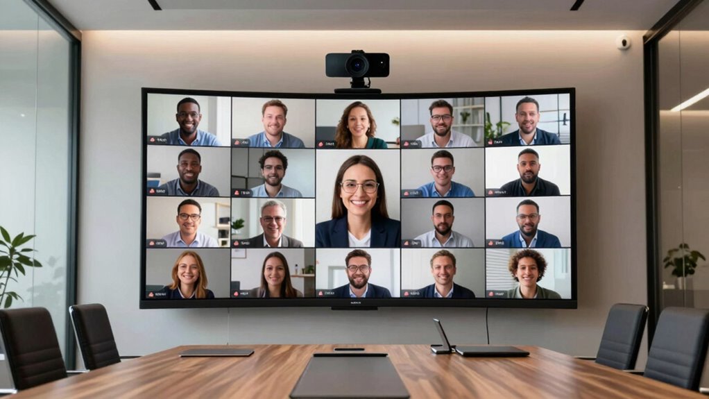 If you’re looking for the best conference webcams for remote teams in 2026, I recommend considering options like the Logitech C922x for solid HD quality, the Bose VB-S for all-in-one superior video and sound, and the Logitech Brio for stunning 4K clarity. Other great choices include the MeetUp 2, Meeting Owl 3, and Anker PowerConf C200, which offer smart features like AI tracking and noise cancellation. Stay with me, and I’ll share more details to help you choose the perfect setup.