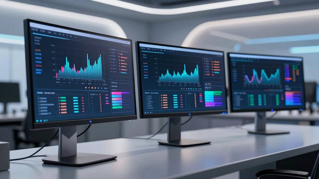 Ergonomic adjustability plays a vital role in choosing a curved monitor that keeps you comfortable during long analysis sessions. Features like height, tilt, swivel, and pivot options let you customize the screen position for maximum comfort. An adjustable stand helps reduce neck and eye strain by allowing you to set the monitor at the perfect angle and height. This flexibility promotes proper posture, which is essential for preventing repetitive strain injuries during extended work hours. VESA compatibility is also important, enabling you to attach custom mounts or arms for even more tailored positioning. Being able to easily adjust viewing angles ensures consistent visual comfort, minimizes glare, and reduces reflections that can cause eye fatigue. These ergonomic features are key to maintaining productivity and comfort over long periods.