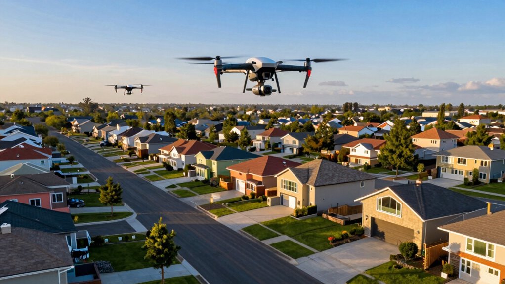 When choosing a drone for real estate videos, prioritizing safety and regulatory compliance is critical to avoid legal issues and guarantee smooth operation. I always make certain the drone meets local aviation regulations, including registration and Remote ID requirements, to fly legally. Obstacle avoidance sensors and failsafe features like automatic Return-to-Home are indispensable for safe flights, especially in crowded areas. Using drones with GPS and geofencing helps prevent flyaways and keeps flights within safe boundaries. If possible, I opt for drones under 249 grams to avoid FAA registration in the U.S., simplifying compliance. Regular firmware updates and reviewing safety guidelines are essential for staying current with evolving regulations and maintaining safe, trouble-free flights. These steps keep my operations legal and secure.