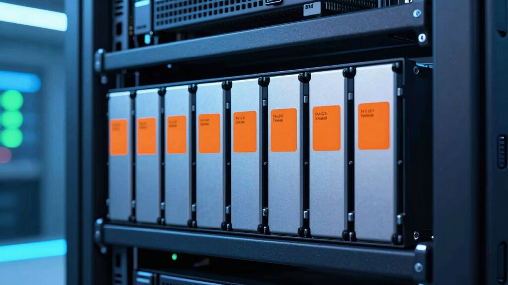 Environmental and rotational vibrations can considerably impact the performance and longevity of enterprise hard drives in NAS systems. Vibration sensors are essential because they detect and compensate for these vibrations, helping to maintain data integrity. In multi-drive NAS setups, proper vibration management prevents performance drops and reduces the risk of drive failure. Drives equipped with rotational vibration (RV) sensors can dynamically adjust read and write operations, mitigating vibration effects in real-time. This capability is especially valuable in high-density environments where vibrations are more pronounced. By actively monitoring vibrations, these sensors contribute to longer drive lifespans and enhance overall reliability. Ultimately, choosing drives with effective vibration sensing guarantees stable operation, protecting your data and maximizing system uptime.