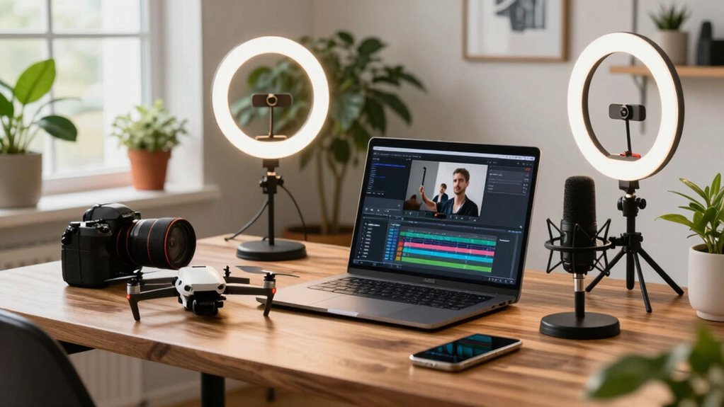 While great visuals grab attention, clear audio keeps viewers engaged. I’ve learned that poor sound quality can drive viewers away, even if the video looks fantastic. That’s why investing in directional microphones, like shotgun mics, is essential. They capture sound from specific sources while cutting out background noise, enhancing clarity. It’s also important to take into account the microphone’s frequency response, ideally between 20Hz and 20kHz, to guarantee both deep bass and high treble sounds are accurately reproduced. Don’t forget about accessories like windscreens; they minimize wind noise and echoes, especially outdoors. Prioritizing audio clarity not only boosts viewer engagement but also elevates the professionalism of your content, making it more appealing across various platforms.