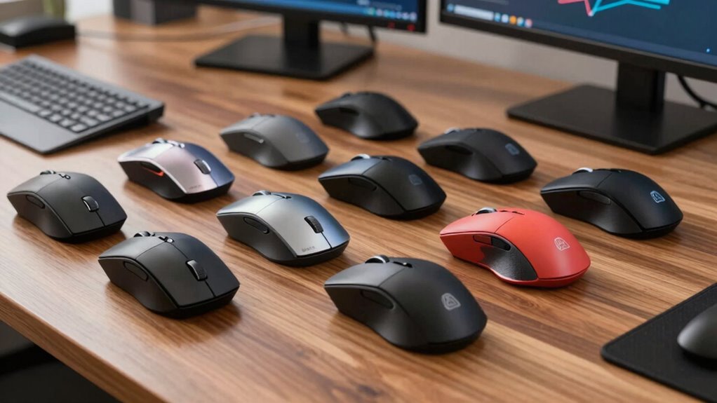 Having multiple connection options is vital for an ergonomic mouse, especially when I need seamless switching between devices or work environments. Support for Bluetooth, 2.4GHz wireless, and USB guarantees I can connect quickly and reliably without hassle. Being able to connect to several devices simultaneously boosts my productivity, as I can toggle between my laptop, tablet, and desktop effortlessly. Compatibility with various operating systems like Windows, macOS, Linux, and Android makes the mouse versatile across all my devices. Wireless range is also essential—some mice support up to 10 meters or more, giving me flexibility to move around my workspace. Additionally, rechargeable batteries with quick recharging features minimize downtime, so I stay focused during long work sessions without constantly worrying about power.