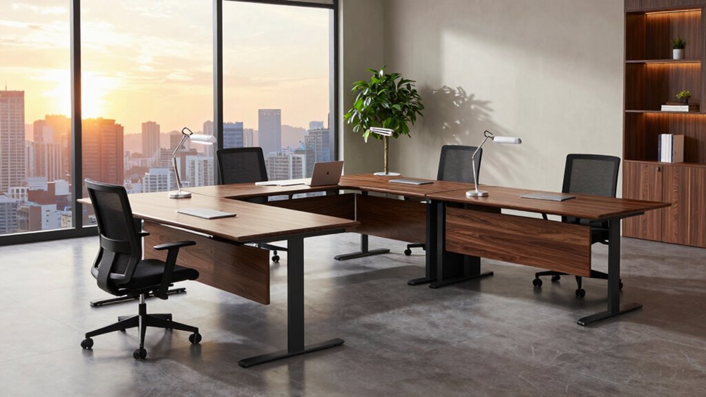 Are noise levels a major concern when selecting an L-shaped standing desk for your corner office? If you’re sensitive to noise, it’s essential to choose a desk with quiet operation. Most desks operate between 48 dB and 55 dB, with high-performance motors around 48 dB, ensuring minimal disruption during height adjustments. Mechanical components like gear systems can add to noise, but well-designed desks keep sound levels low. Keep in mind that heavier loads can increase noise, so selecting a desk with a higher load capacity helps maintain quietness. For those particularly sensitive, look for desks explicitly labeled as quiet or equipped with features like soft-start motors. Prioritizing noise considerations will help create a more comfortable, distraction-free workspace.