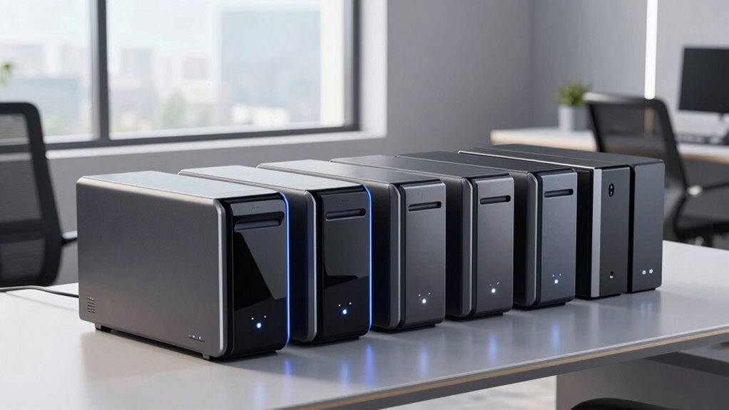 Budget considerations play a essential role in selecting a NAS for Office Time Machine backups, as they directly influence the type and features of the device you can afford. Your budget will determine whether you choose a diskless NAS to add drives later, a pre-configured model, or a high-capacity system with drives included. Keep in mind, the total cost includes not just the NAS itself but also compatible hard drives, which can markedly increase expenses. While investing in a more expensive NAS with advanced features like faster ports or encryption might offer better long-term value, it could go beyond your initial budget. Comparing prices and exploring options like price matching can help you find the best deal, and considering future upgrade costs guarantees long-term affordability.
