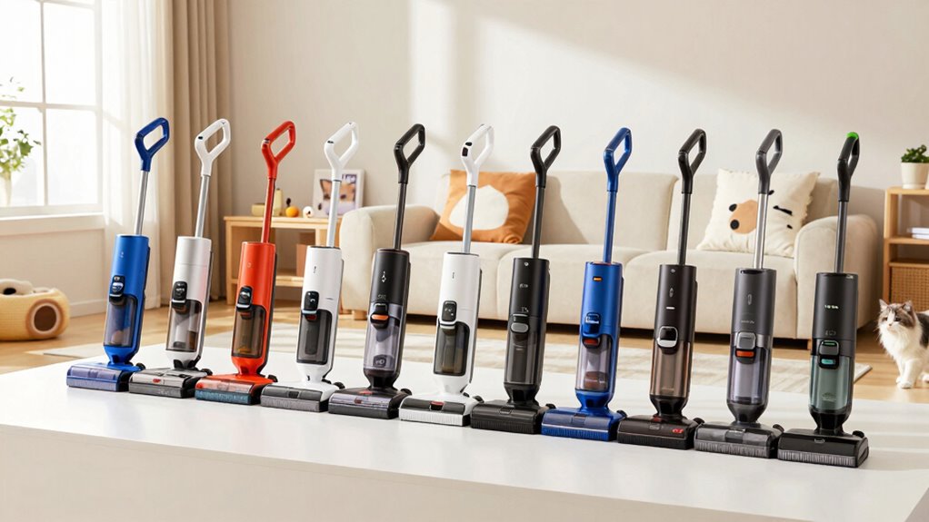 After considering tank capacity, it’s time to focus on the cleaning technology features that really make a difference for pet owners like me. Advanced systems that combine spray, scrub, and suction enhance stain and odor removal efficiency, which is essential for tackling pet messes. I appreciate self-cleaning features that flush out dirt and hair after each use, maintaining hygiene effortlessly. Technologies like HydroSteam, which pair steam with powerful suction, are fantastic for deep cleaning and eliminating bacteria. I also prefer dual-tank systems; they separate clean and dirty water, ensuring a hygienic clean. Finally, a high-powered suction, ideally rated at 15KPa or higher, is vital for extracting embedded dirt and stubborn pet stains effectively.