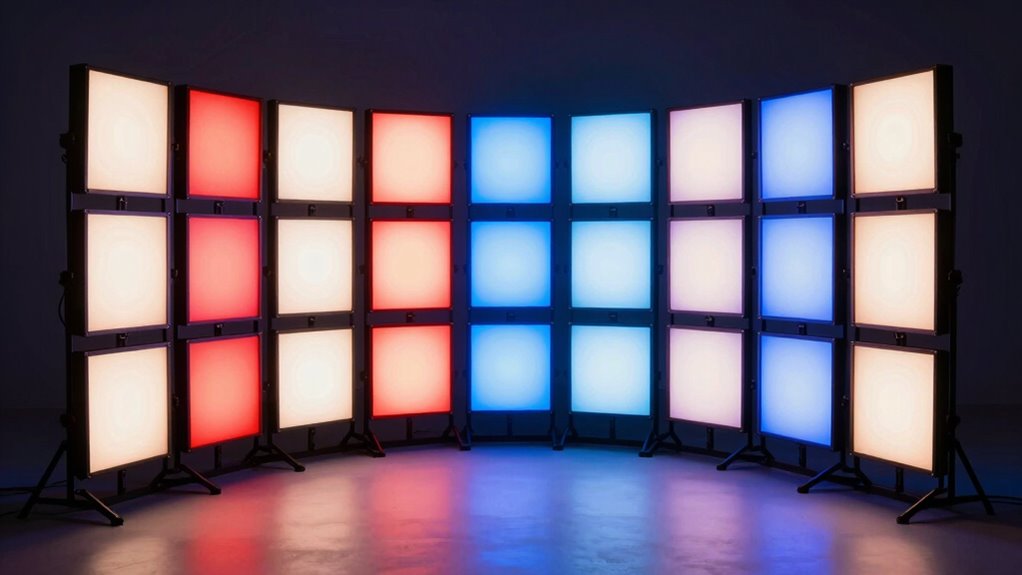To get the most out of RGBWW LED panel lights in a studio setting, it’s essential to contemplate their power options and efficiency. Look for panels that support multiple power sources like USB-C PD, AC adapters, and batteries to adapt to different shooting environments. Devices with low power consumption and high luminous efficacy prolong usage and cut energy costs. Portable options that support NP-F or V-mount batteries enable on-location filming without relying on outlets. Efficient power management features, such as intelligent dimming and power-saving modes, help maximize battery life and reduce heat. Additionally, quick power source switching guarantees seamless transitions between mains power and batteries, keeping your shoots uninterrupted. Prioritizing these factors guarantees versatile, reliable, and cost-effective lighting.
