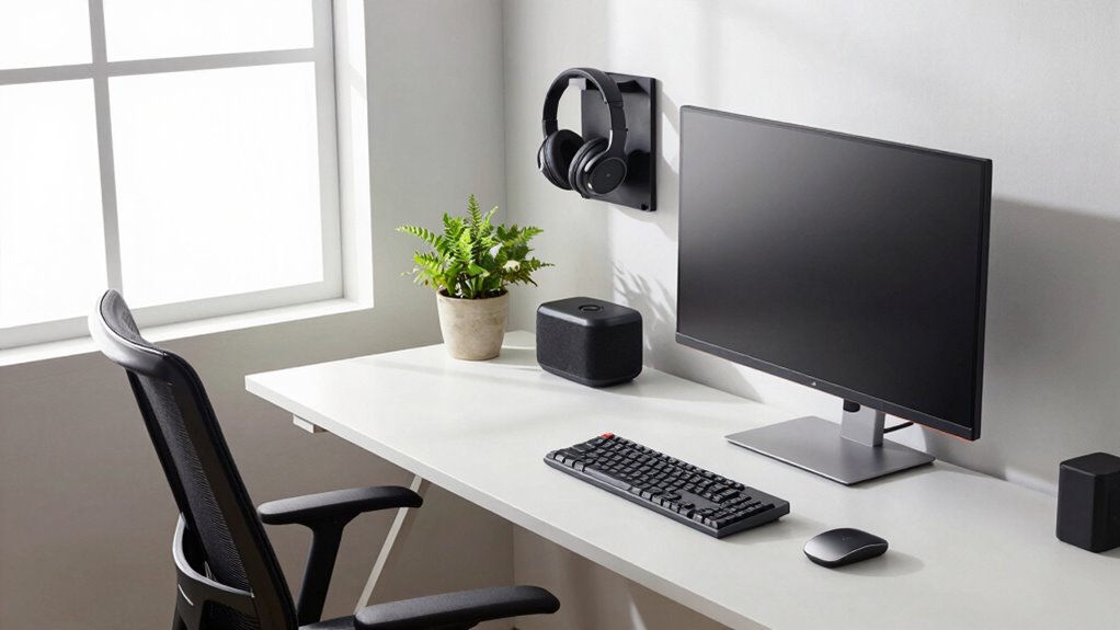Battery life plays an essential role in my selection of work-from-home equipment, especially since I often find myself in lengthy meetings or focused work sessions. When choosing headsets, I look for options that offer up to 65 hours of use. This guarantees I can stay productive without interruptions. I also prioritize devices with rapid-charging features, so I can quickly recharge and get back to work. It’s vital to select equipment that supports all-day use on a single charge; for instance, I appreciate conference speakerphones that provide over 10 hours of talk time. Finally, I consider the integration of power-saving technologies, as they enhance battery efficiency, allowing me longer usage between charges while maintaining performance.